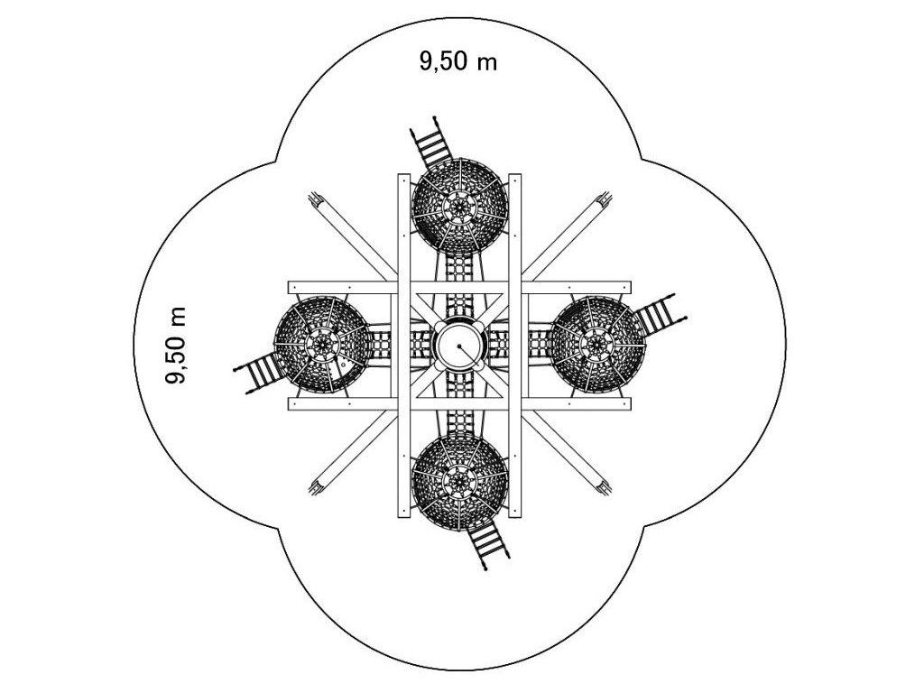 Výška prvku: 7,15 m Rozměry prvku:6,60 x 6,60 m Plocha na ochranu proti pádu: 62,00 m2 Min. bezpečný prostor: 9,50 x 9,50 m Výška pádu: 3,00 m Potřebné množství betonu: 2,10 m3 Počet uživatelů: 74Doplňkové parametry