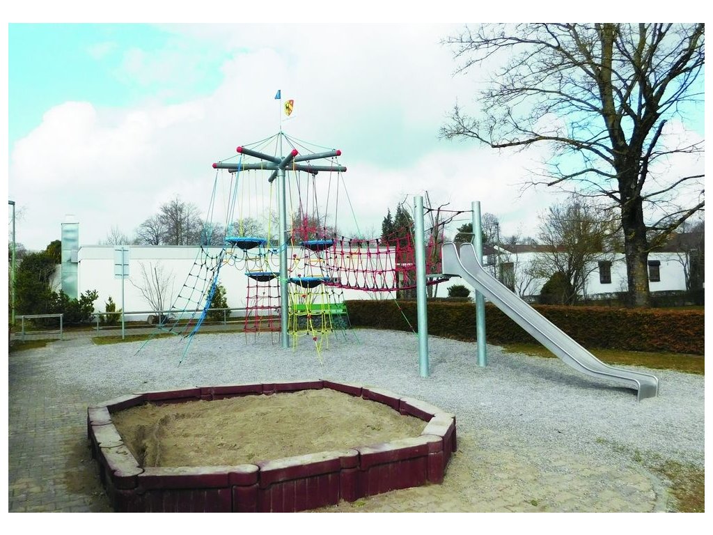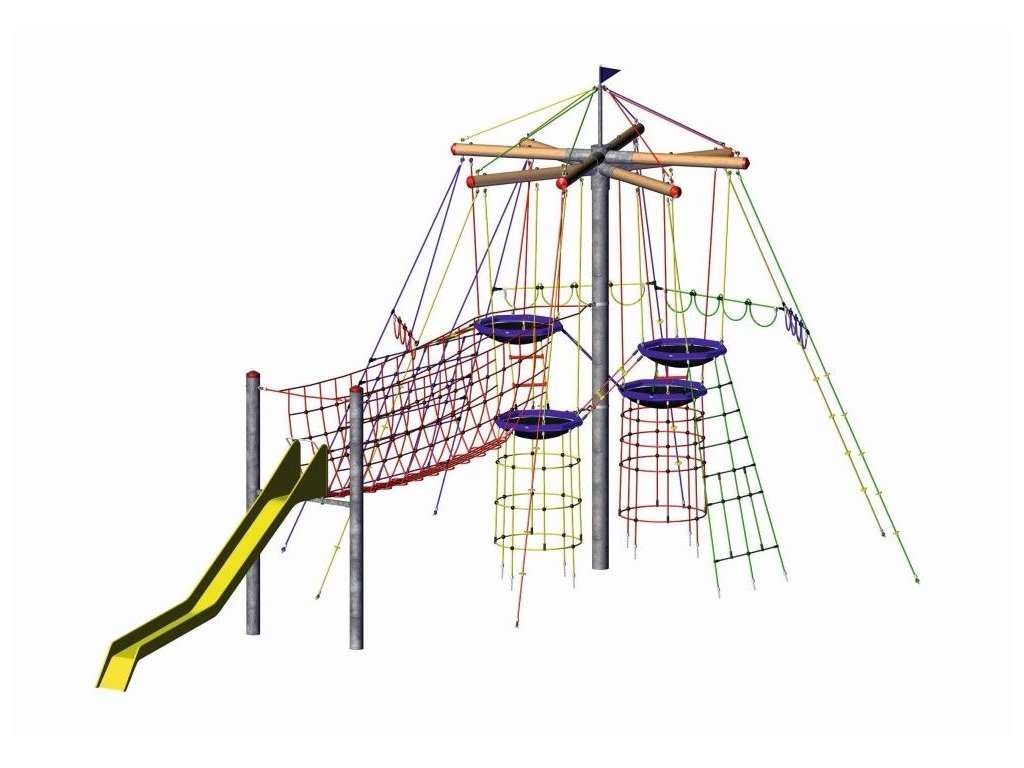 1 oceľový stĺp ø 193,70 mm, žiarovo pozinkovaný, dĺžka 6,20 m s krytom lepené lakované drevené väzníky 4 vtáčie hniezda Huck s rebríkmi 2 výstupové siete 5 šplhacích lán 2 šplhacie komíny rôzne festónové laná 1 sieťový most 1 sklolaminátové šmýkacie laná a siete Herkules 16 mm Výška prvku: 5.95 m Rozmery prvku: 13,00 x 7,10 m Plocha ochrany proti pádu: 101,00 m2 Min. bezpečná plocha: 16,45 x 10,20 m Výška pádu: 2,80 m Potrebné množstvo betónu: 4,40 m3 Počet používateľov: 67Dodatočné parametre