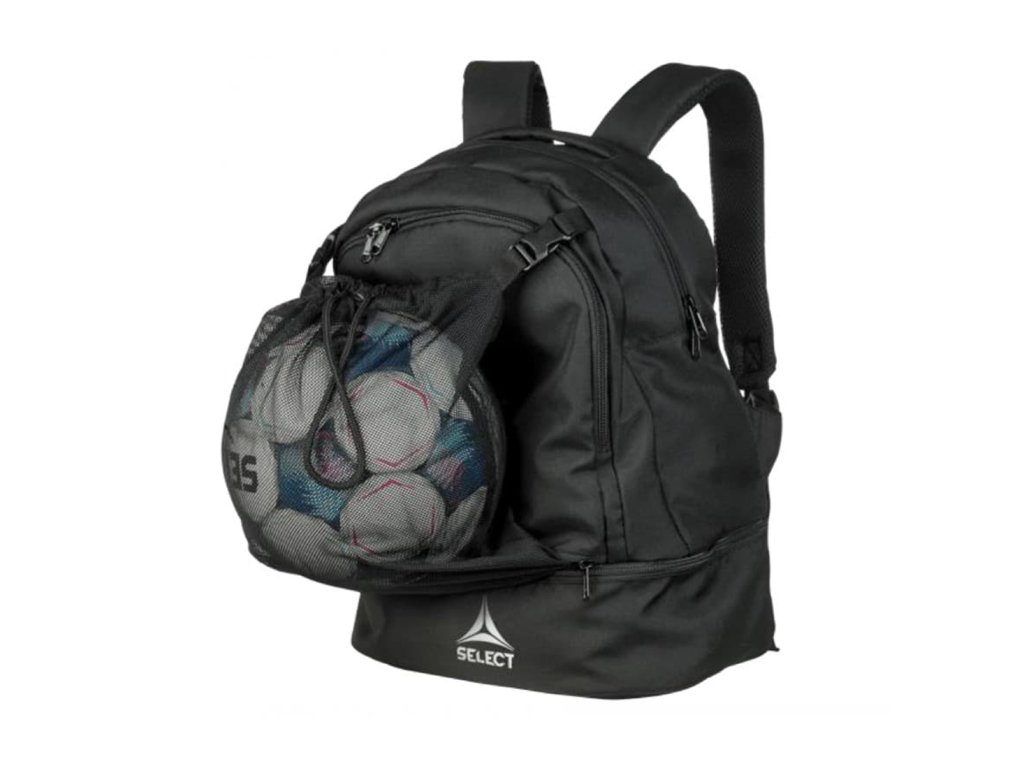 Sportovní batoh má dvě kapsy. Na přední straně je umístěné velké logo značky SELECT. Batoh je dále vybaven postranní síťkou na lahev, v přední části lze připnout síťku na míč a ve spodní části je úložný prostor pro obuv. Vyroben ze 100% polyesteru s velmi odolnou vrstvou PU. Spolehlivé zipy YKK. Objem 25 litrů.