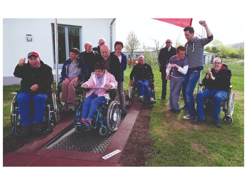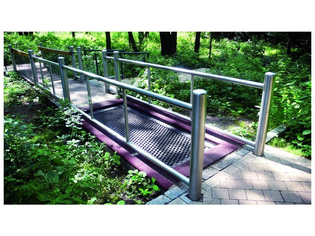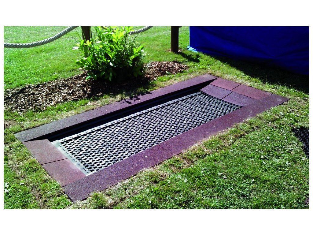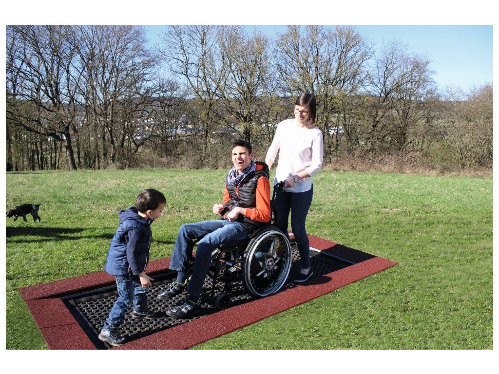 skákací plocha: protiskluzová rohož ( plastové články ) chráněná proti vandalismu pro střední výšku skákání kolem dokola řada desek na ochranu proti pádu (pro napojení postačí trávník) rám k zapuštění do země rychlá montáž bez betonu Výhody: 2 rampy pro bezpečné a snadné sjíždění a najíždění čištění: vyvěšení rohože flexibilní plocha pro jemné pružení a houpání doprovodná osoba může být v přímém kontaktu s vozíčkářem Vnější rozměry: 1.75 x 3.00 m Plocha na skákání: 1.10 x 1.55 m Plocha na ochranu proti pádu: 27.20 m2 Min. bezpečný prostor: 5.10 x 6.35 m Výška pádu: 1.00 m Počet uživatelů: 3 Bez nutnosti betonováníDoplňkové parametry